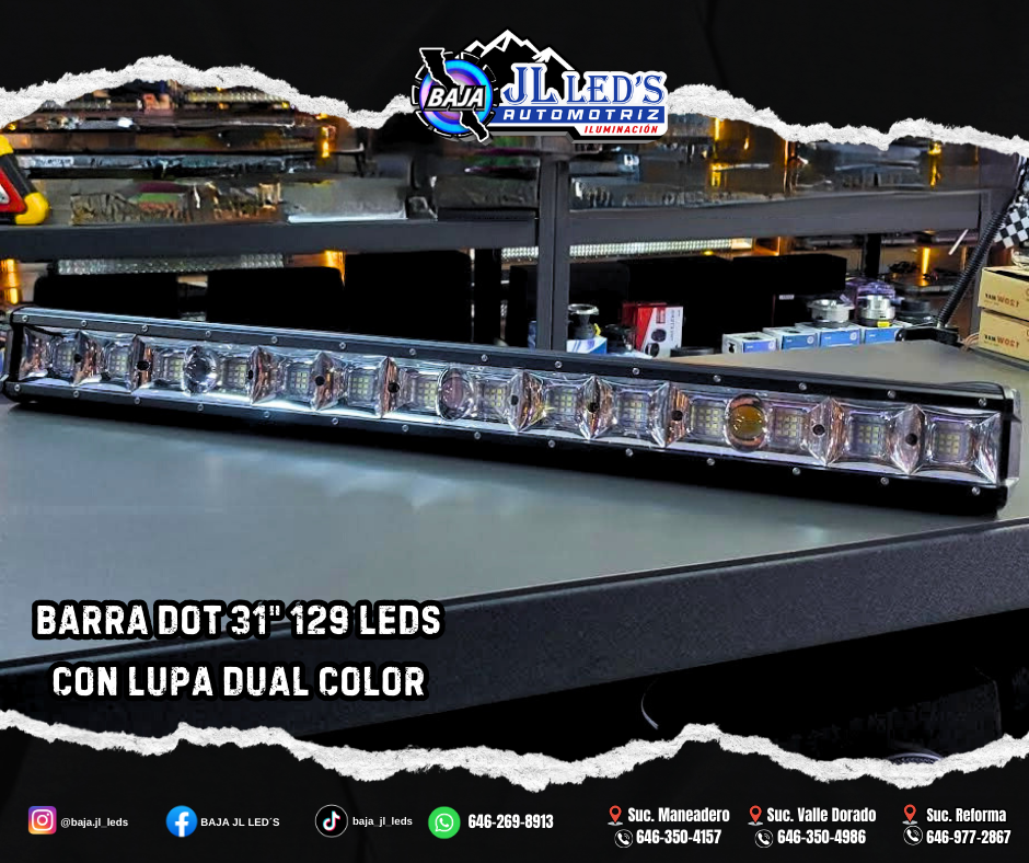 Barra DOT 31″ 129 LED’S 408w 9-30v c/ Lupa Dual Color 6500k/3000k spot and flood pz Voltaje: 9-30v Potencia: 408w Color: Blanco Temperatura: 6500k Spot and flood
