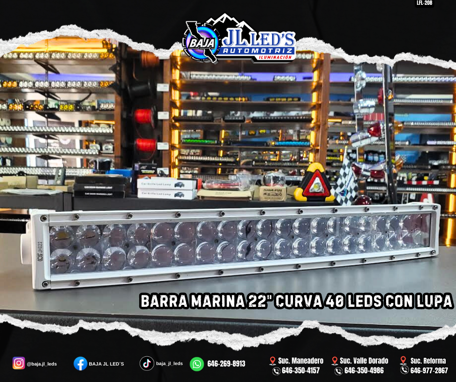 Barra marina 22″ curva 40 led’s c/ lupas blanco frio 6500k 120w 12-36v bases orilla pz Voltaje: 12-36v Potencia: 120w Temperatura: 6500k Leds: 40 Modelo: Lupa Poteccion: Marina