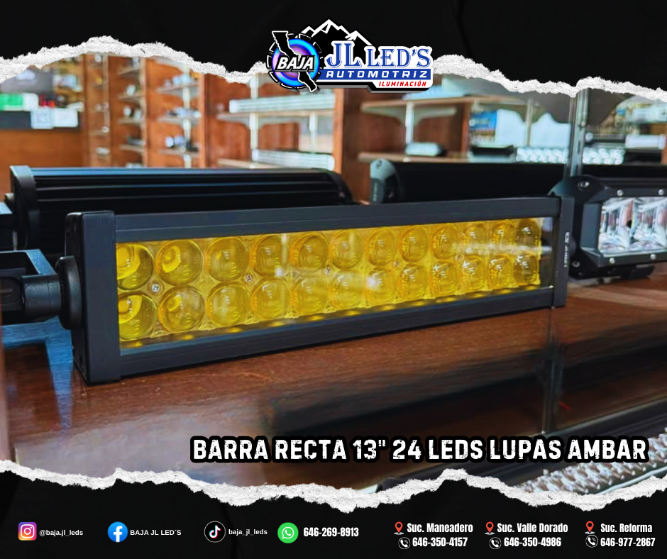Barra Recta 13″ 24 LED?S 72w 9-32v c/ Lupas Ambar 3000k spot pz Dimensiones: 13″ Potencia: 72w Voltaje: 9-32v Color: Ambar Tipo: Lupas Temp: 3000K