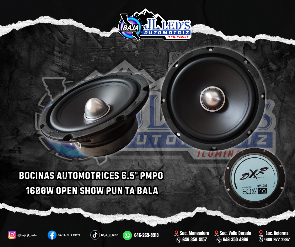BOCINAS AUTOMOTRICES 6.5″ PMPO 1600W OPEN SHOW PUN TA BALA PAR 80W por bocina 4 amperes 6.5″ SONIDO