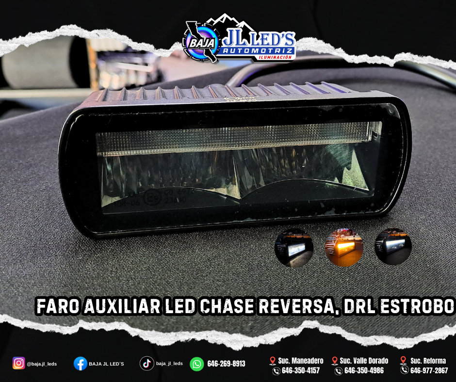 Faro Auxiliar LED CHASE Reversa, DRL estrobo 9-30v 23w rectangular 12.4 x 4.7 x 8.2 cm PAR Color: Blanco, Ambar y Rojo Voltaje: 9-30v 23 watts Medidas: 12.4cm x 4.7cm x 8.2 cm Cambus EMC Bulbo para: -Cuarto -Direccional -Stop