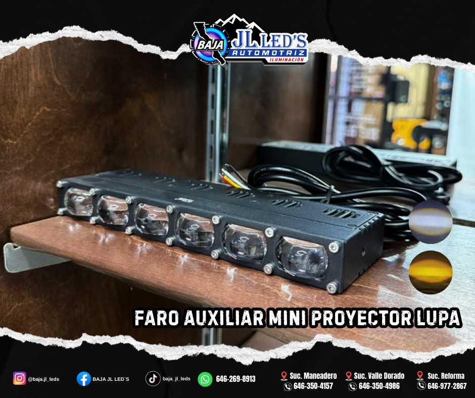 Faro auxiliar mini proyector led Laser Slim SIX lupas 10.8×2.6x7cm 95w 12-24v luz blanco ambar y combinado par