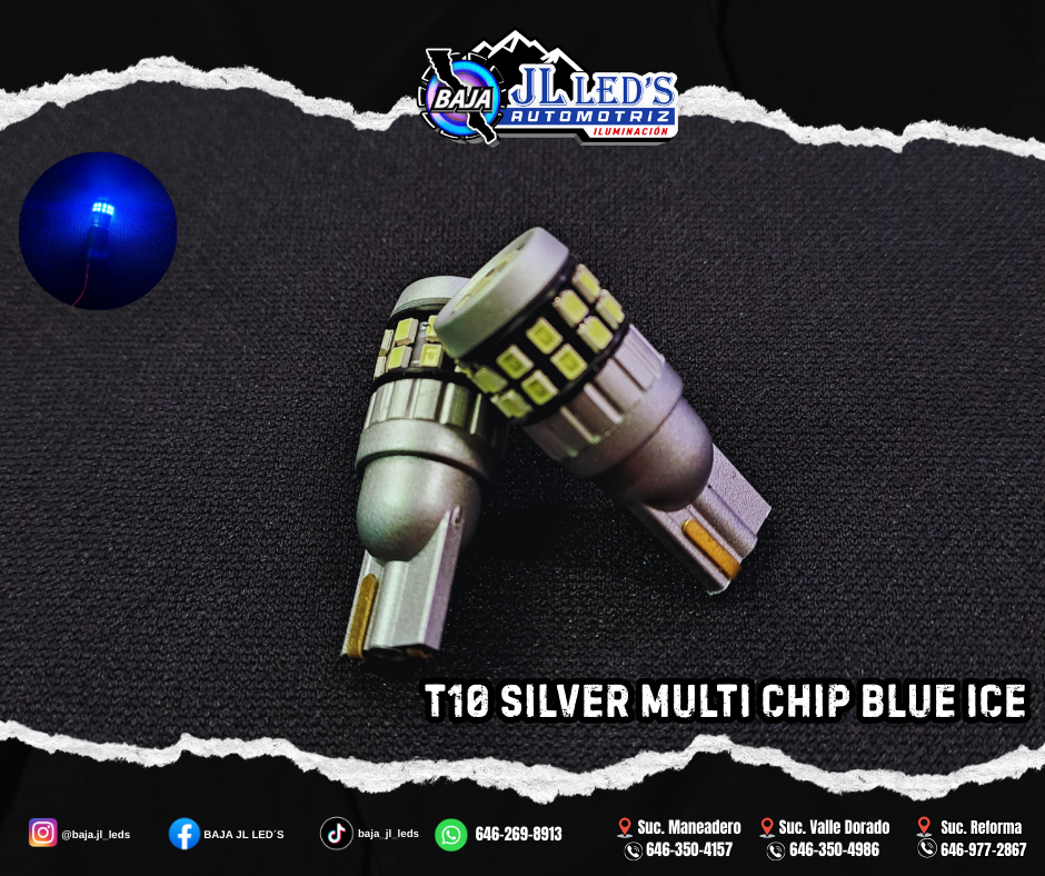 FOCOS T10/158 2.2W SILVER MULTI CHIP 30 LED ICE BLUE 7000K 9-60V 1800LM CON CANBUS PAR Medida: T10/158 Color: Azul Temp: 10000 K 2.2 watts Lumens: 1800 Cambus EMC Bulbo para: -Cuarto -Direccional -Stop Corroborar medida con su vehiculo.