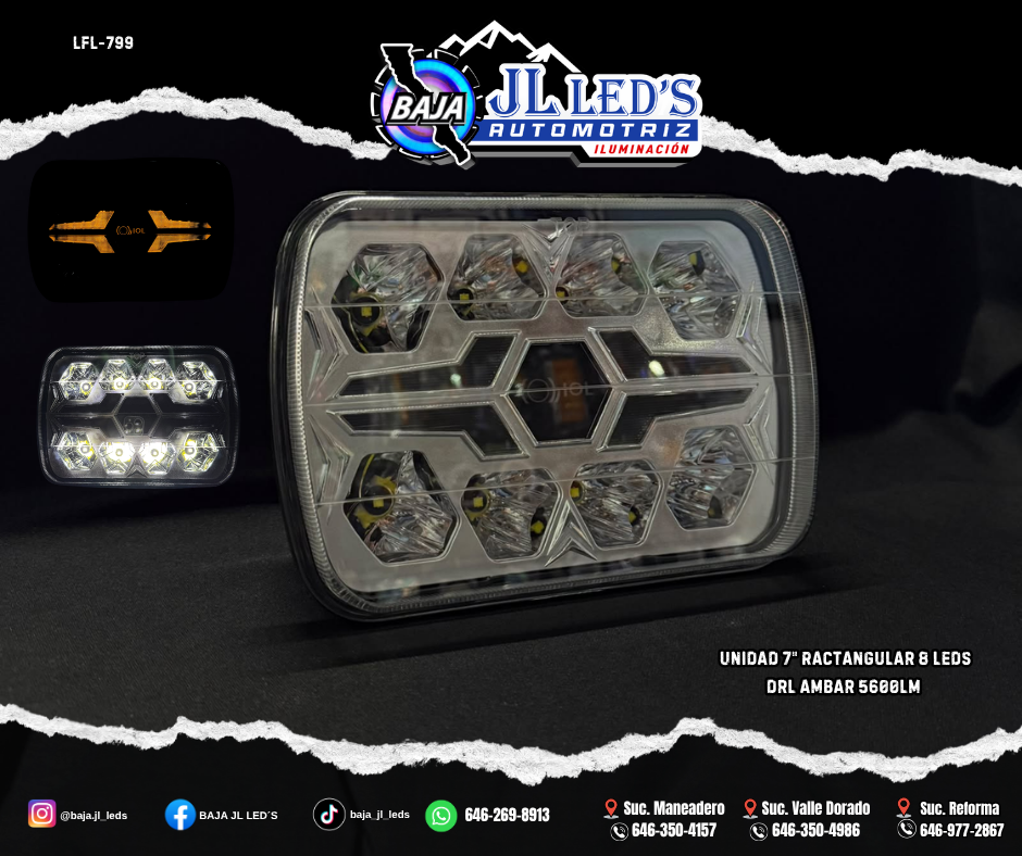Unidad 7″ Ractangular 8 leds conos drl ambar 9-30v 42w 6000k 5600lm par Modelo 7″ Voltaje: 9v-30v Potencia: 42w Lumens: 5600lm