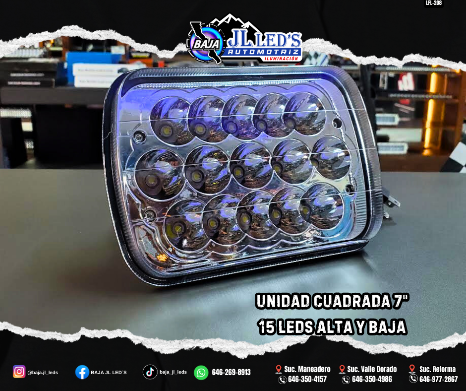 Unidad Cuadrada 7″ 15 Leds Cree Alta y Baja Plug and Play H4 par Voltaje: 9-30v Potencia: 9-30w Alta y Baja