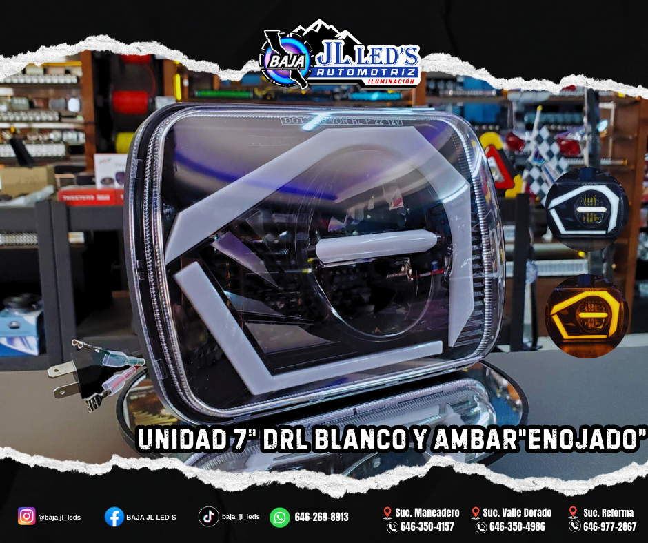 Faros led unidad cuadrada 7″ Enojados (‘-\/-‘) luz blanca Altas y Bajas DRL dual color 19.5 X 14.3 X 9.5cm 25/42W 12-24v par
