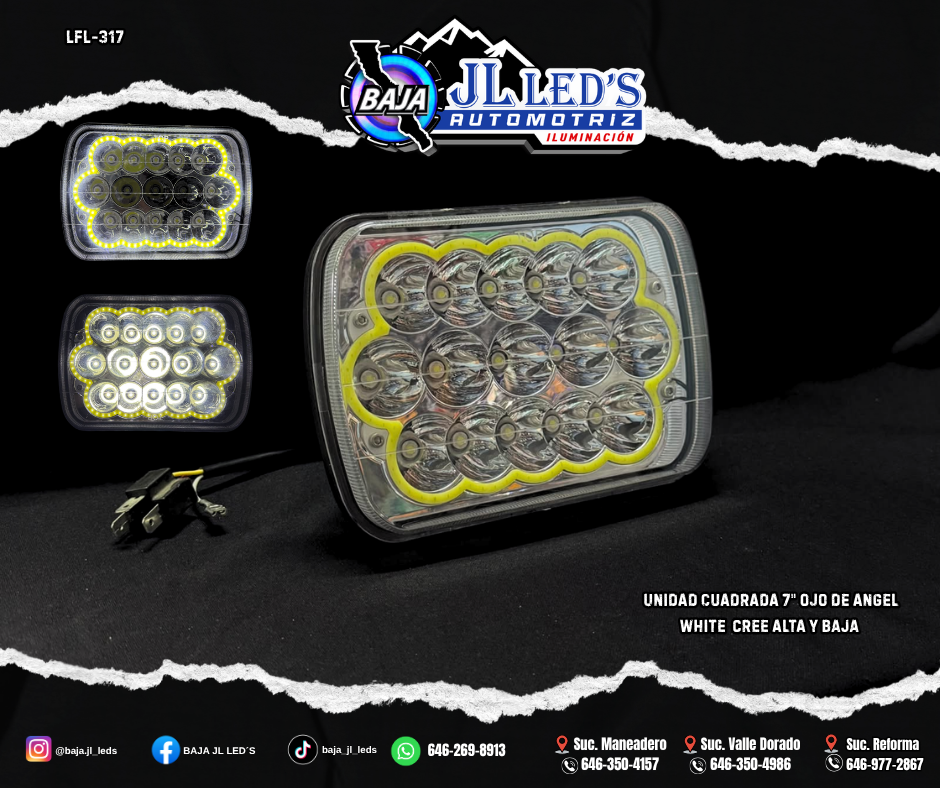 Unidad Cuadrada 7″ Ojo de angel White 15 Led´s cree alta y baja plug and play H4 par Alta y Baja Conector: H4 15 Leds DRL: Blanco