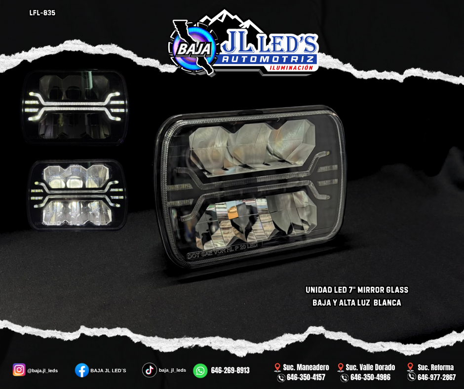 Unidad LED 7″ Mirror Glass BAJA Y ALTA 18/36W 9-30V luz de dia Blanca IP67 Certificado DOT SAE par Dimension: 7″ ALTA Y BAJA Potencia: 18-36W Voltaje: 9v-30v DRL Blanco Protecciones: IP67 Certificación: DOT SAE